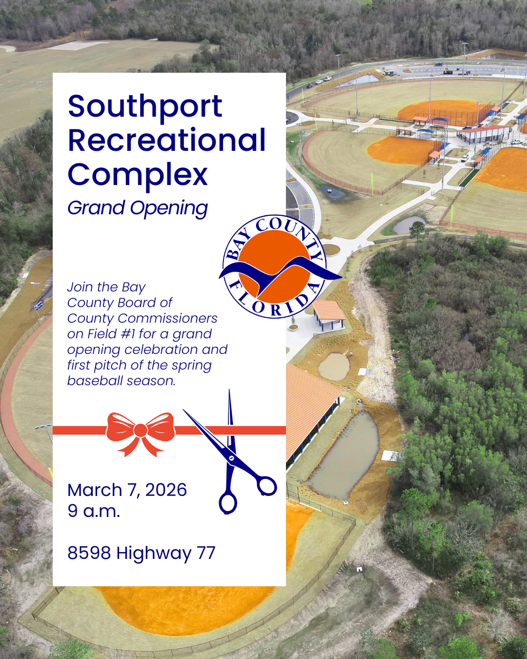 Bay County will celebrate the grand opening of the new Southport Recreational Complex with a ceremonial first pitch at 9 a.m. on Saturday, March 7. The park is located at 8598 State Road 77. The ceremony will coincide with the start of spring league baseball, marking the official opening of the county’s newest recreational facility.